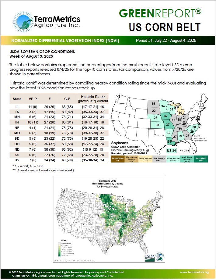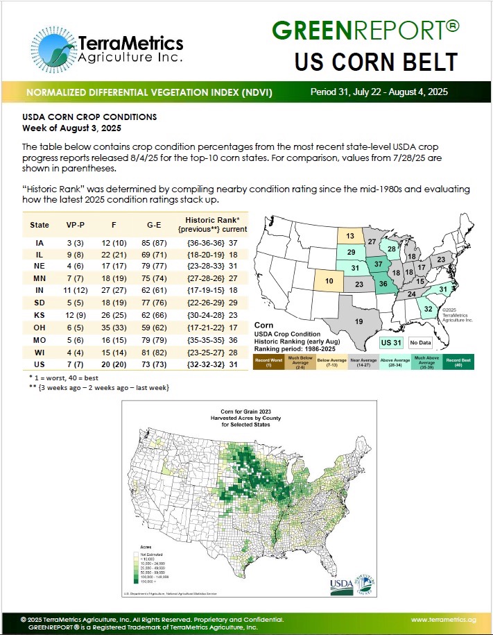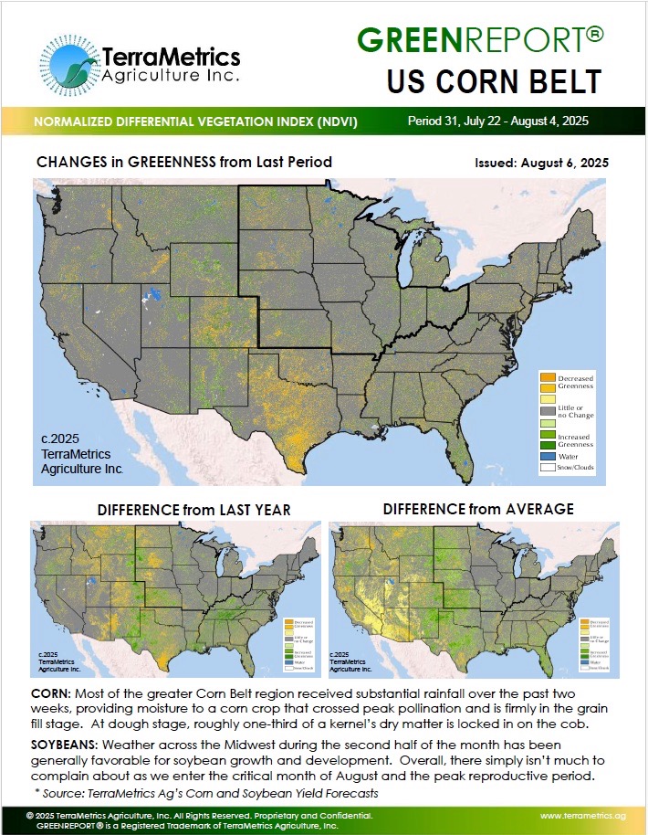 GreenReport Corn Latest TerraMetrics.ag Corn Belt GreenReport® Below is our most recent Corn Belt GreenReport® – Download a PDF here Want to see more? Click here to see our archive of previous GreenReports®. For more information or to subscribe, Contact Us now! When you can’t make it to the field to check crops, let the TerraMetrics GreenReport® take you there. Contact Us Now