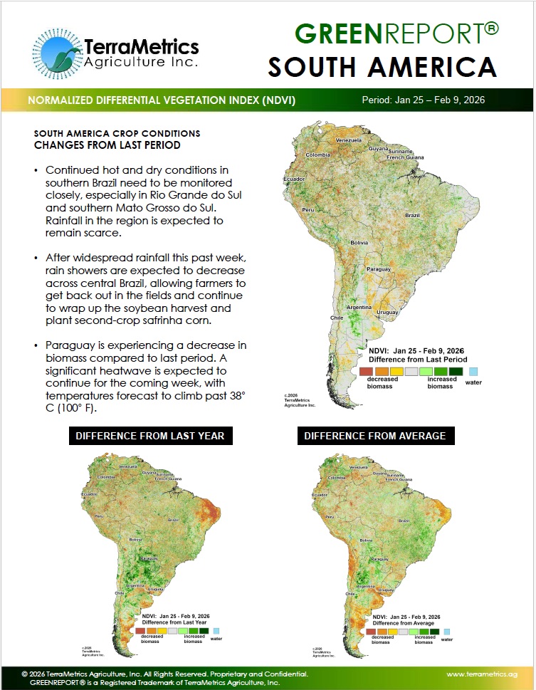 GreenReport South America Latest TerraMetrics.ag South America GreenReport® Below is our most recent South America GreenReport® – Download a PDF here Want to see more? Click here to see our archive of previous GreenReports. For more information or to subscribe, Contact Us now! When you can’t make it to the field to check crops, let the TerraMetrics GreenReport® take you there. Contact Us Now