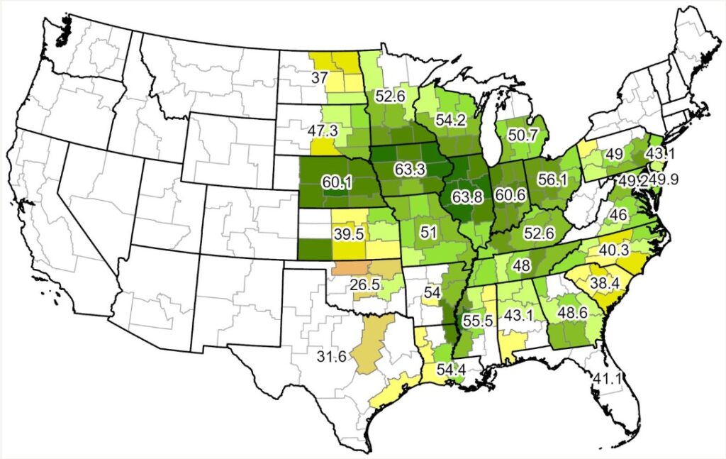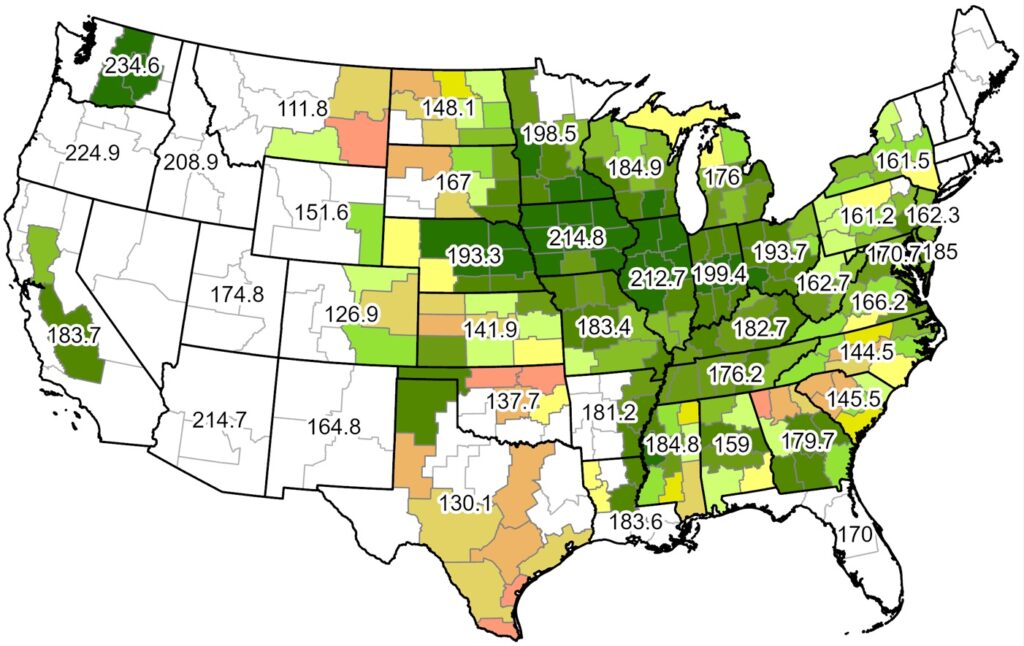 TerraMetrics Ag’s satellite greenness-based estimate for the 2025 US corn crop is 186.2 bu/ac, which is 2.7 bu/ac above the 30-year trend line yield projection and 6.9 bu/ac above last year’s record-setting crop. For perspective, the second highest US yield is 177.3 bu/ac achieved in 2023. Based on recent crop progress reports, over two thirds of the crop was locked in on the crop. Crop maturation should continue to advance at a good pace over the next two weeks. With about one third of grain fill remaining nationally, a couple of major wildcards remain that are sure to have an impact on final yield as combines roll. August moisture across the central and eastern Corn Belt was quite low by historical standards. On the other hand, every top producer in the western Corn Belt is on track for above-trend and even record yield.